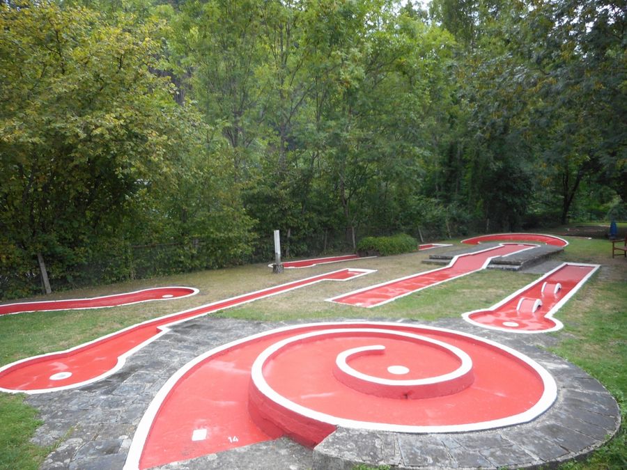 Minigolfanlage mit 18 abwechslungsreichen Bahnen in Vianden, ideal für einen Ausflug mit der ganzen Familie in ruhiger Umgebung an der Our.