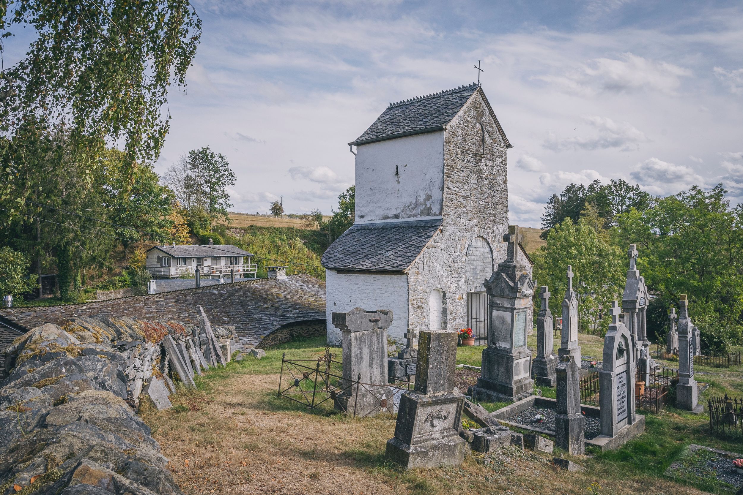 Das Dorf ist reich an Trockensteinmauern, angefangen bei der außergewöhnlich schönen runden Friedhofsmauer. Ihre zahlreichen schützenden Mikrohöhlen ermöglichen es dem erfahrenen Naturforscher, hier kleine Wunder der Flora und Fauna zu entdecken. Im Inneren dieser Mauer hat man einen direkten Blick auf ein bemerkenswertes Dach aus Cherbins (relativ dicke, schuppenförmige Schieferplatten, die die Dächer der Ardennen bedecken). Unterhalb der Kirche thront ein wunderschönes, sehr bekanntes Gebäude. Das Gebäude war zunächst ein Pfarrhaus und später das Haus des Ardenner Fotografen Edmond Dauchot und ist von einem eingemauerten Garten umgeben. Die Architektur bleibt perfekt erhalten, auch wenn die Mauern nicht mehr mit Kalk verputzt sind.
