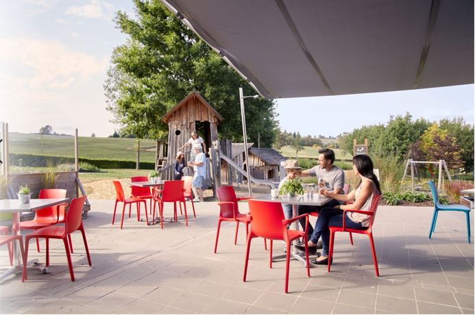 Genießen Sie auf der Terrasse die Sonne und die frische Luft während die Kinder sich auf dem anliegenden Spielplatz austoben. Neben dem Spielplatz zählen ein Labyrinth, ein Barfußpfad sowie ein Sportplatz zu unserem Park im Außenbereich.