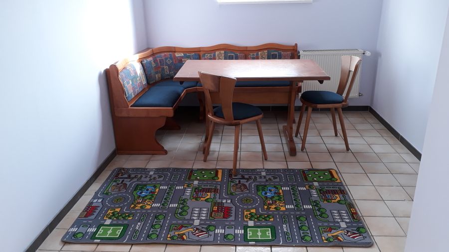 Der Außenbereich verfügt über eine kleine Terrasse mit Liegestühlen, auf der Sie sich in kleinerem Kreis entspannen können. Es gibt aber auch eine zweite, größere Terrasse mit Gartenmöbeln und Schwenkgrill. Der wunderschöne Garten ist mit Hecken umgeben und bietet verschiedene Spielbereiche für Kinder (Trampolin, Rutsche, Spielwiese etc.).