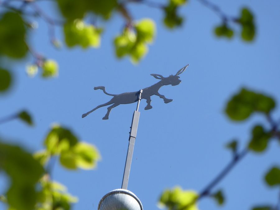 Von hier aus hast du einen perfekten Blick auf das Wahrzeichen Diekirchs: Den Esel auf der Turmspitze der Alten Kirche – ein weltweit einmaliger Anblick.