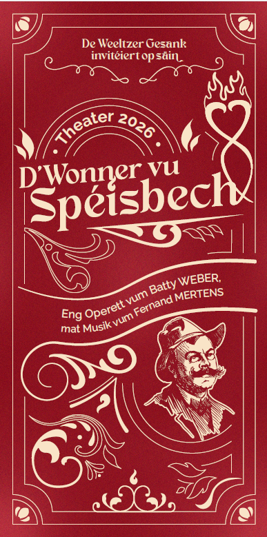 Mir spillen dëst Joer „D’Wonner vu Spéisbech“, engt Koméidistéck vum Batty Weber, mat Musik vum Fernand Mertens.
