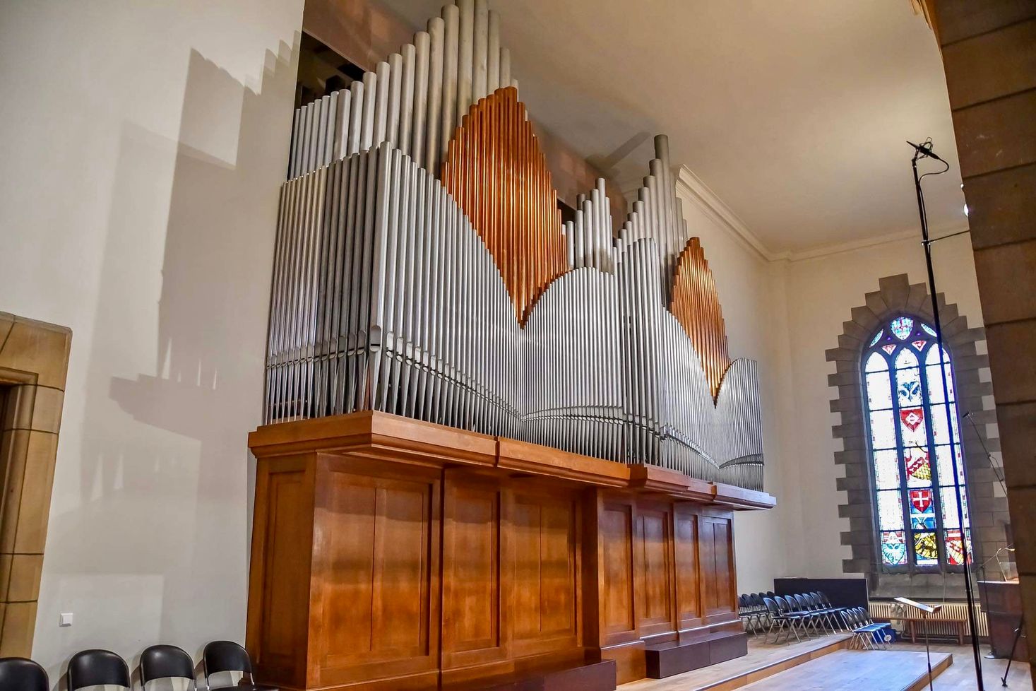 Tyler Boehmer, 2. Preis und Publikumspreis beim Orgelwettbewerb von Dudelange in 2023, gibt den Abschlußkonzert des Bach on Bike-Events.