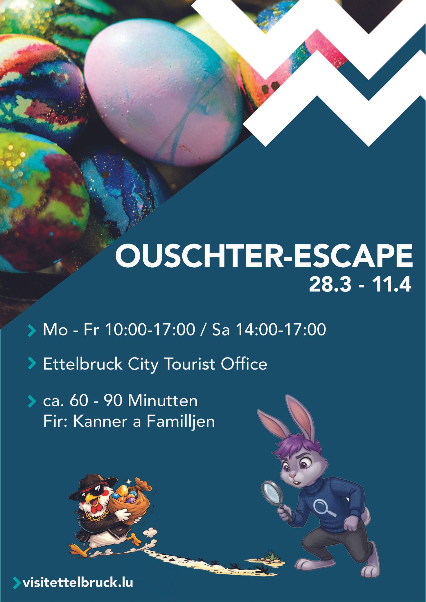 Das freche Gangster-Huhn Charly hat das magische goldene Ei gestohlen und irgendwo in Ettelbrück versteckt. Es hat in der ganzen Stadt Hinweise und Rätsel verteilt, die euch dabei helfen, den Code für den Tresor zu finden