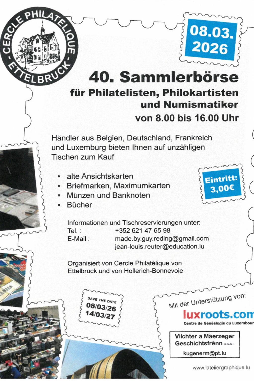 Wann? Sonntag 08.03.202608:00 - 16:00 Uhr Sammlerbörse Wo? 6, rue du Deich, L-9012 ETTELBRUCK Märkte SammlerbörseAnsichtskarten.Briefmarken.MaximumkartenMünzenBanknotenBücher©echo.luDie nächsten TermineSonntag 08.03.202608:00 - 16:00 Uhr