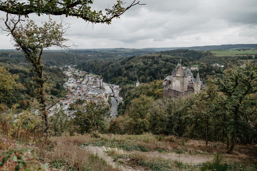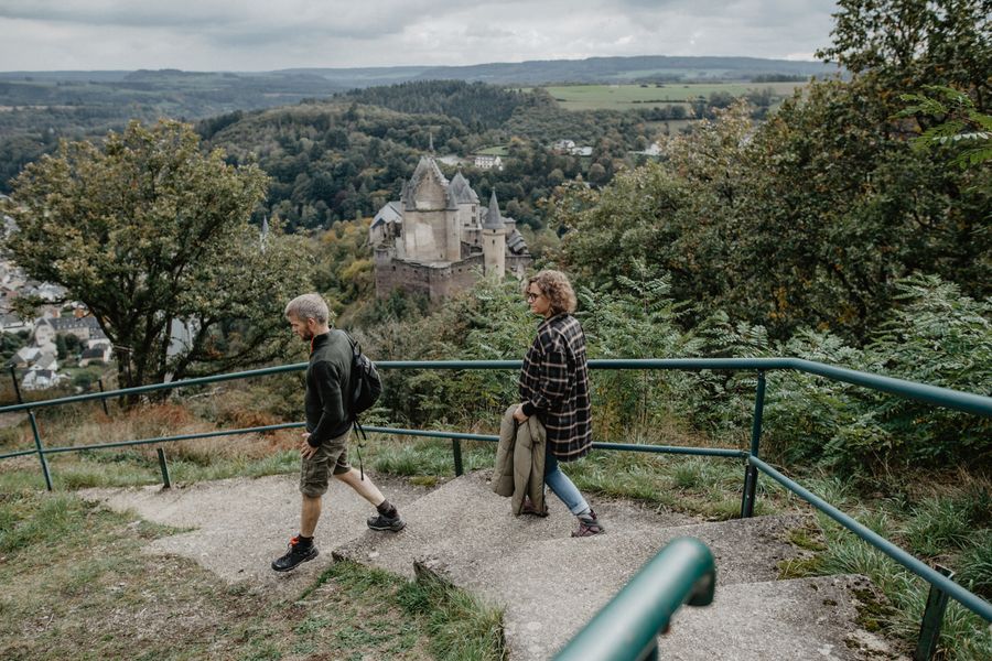 Le point de vue situé à la station supérieure du télésiège de Vianden offre une vue imprenable sur la ville, le château et la vallée de l'Our. Il est accessible soit à pied, soit en télésiège.
