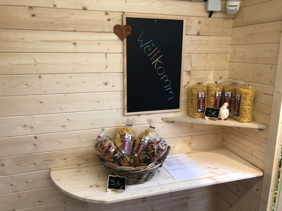 Petit magasin en libre-service à la ferme à Erpeldange avec des produits régionaux.