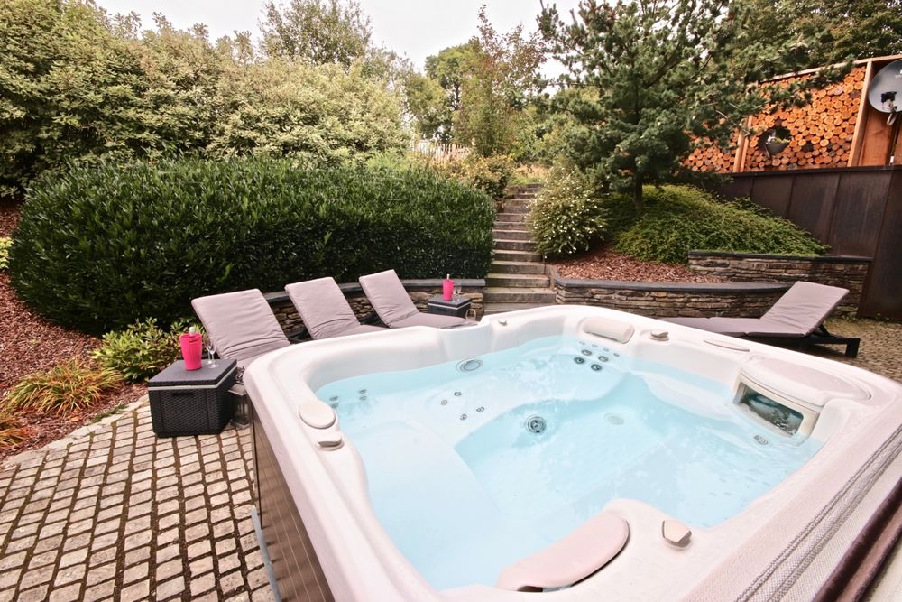 A l'extérieur, vous trouverez le jacuzzi Hotspring avec de jets de massage Moto. 2 terrasses avec des meubles de jardin et une pelouse qui fournit suffisamment d'espace pour les enfants.