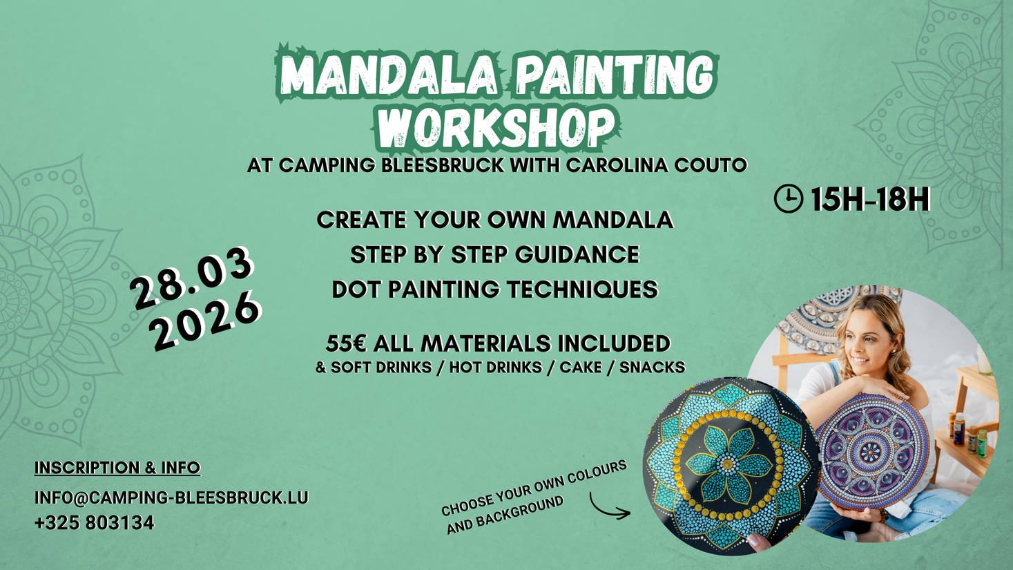 Quand ? Samedi 28.03.202615:00 - 18:00 ATELIER MANDALA Où ? 1, Bleesbruck, L-9359 Dikrech Formations/conférences RENCONTRE CRÉATIVECRÉEZ VOTRE PROPRE MANDALAGUIDE ÉTAPE PAR ÉTAPETECHNIQUES DE PEINTURE PAR POINTS.CHOISISSEZ LES COULEURS ET LE FOND.SNACKS ET BOISSONS INCLUSATMOSPHÈRE CHALEUREUSE©CAMPING BLEESBRUCKDates des prochains événementsSamedi 28.03.202615:00 - 18:00