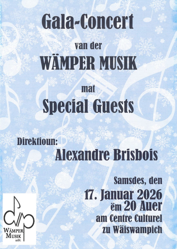 Le concert de gala de la Wämper Musik aura lieu le samedi 17 janvier 2025 à 20 heures au centre culturel de Weiswampach.
