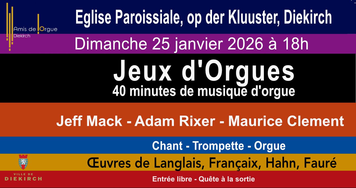 Quand ? Dimanche 25.01.202618:00 - 19:00 Jeff Mack - Adam Rixer - Maurice Clement Où ? -, place Guillaume, L-9279 Festivals de musique Chant - Trompette - OrgueConcert Chant, Trompette & Orgue.Diekirch.©Amis de l'Orgue DiekirchDates des prochains événementsDimanche 25.01.202618:00 - 19:00