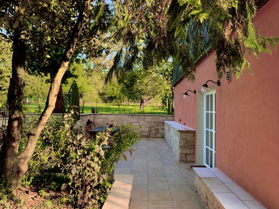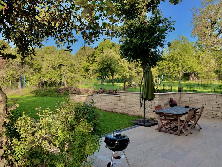 Terrace: The terrace borders the garden, but is separated on both sides by a natural stone wall. The terrace is not quite finished yet, but can be used without any problems (60 m2).