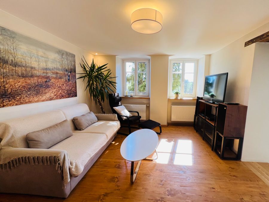 Kitchen: The entrance to the apartment leads you directly into a large, bright and modern kitchen with a wooden table and sofa. There is a wood-burning fireplace that heats almost the entire apartment quickly and comfortably and creates a very cozy atmosphere. From the kitchen you have direct access to the large living room as well as the bathroom or storage room. Part of the kitchen is the double glass door to the west, which offers access to the terrace and garden.