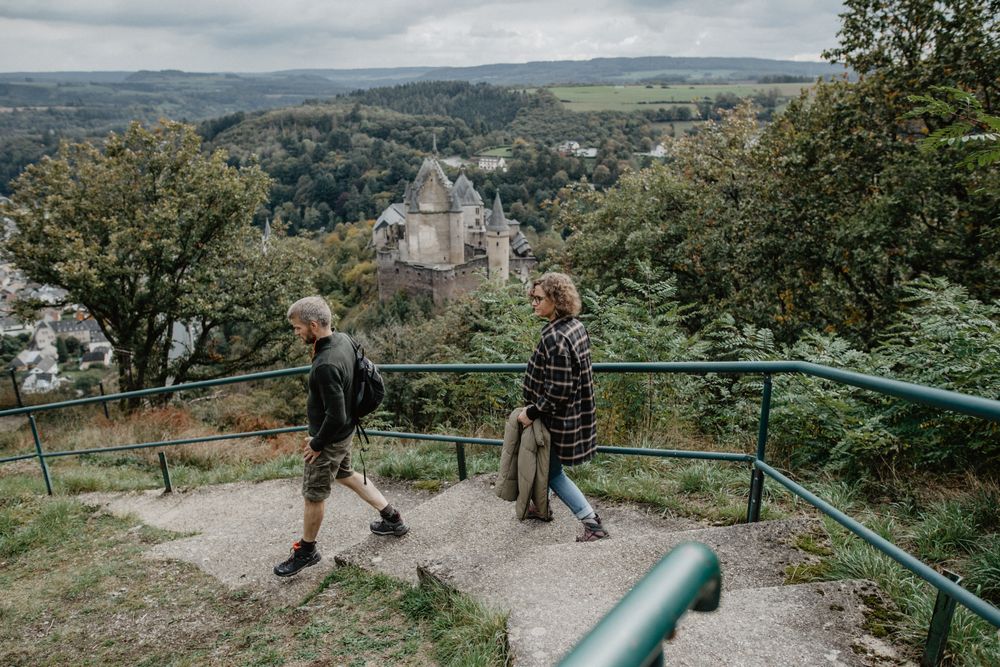 Het uitkijkpunt bij het bergstation van de stoeltjeslift in Vianden biedt een adembenemend uitzicht over de stad, het kasteel en het Ourdal. Het kan te voet of met de stoeltjeslift worden bereikt.