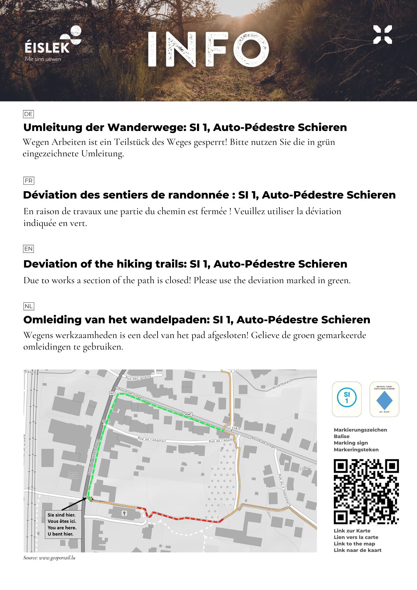 Deze traditionele wandelpaden, aangelegd door het Ministerie van Economische Zaken, zijn in heel Luxemburg te vinden. Er zijn er 43 in Éislek. U kunt hun vertrekpunten gemakkelijk met de auto bereiken. De Auto-Pédestre paden vullen de andere rondwandelingen in Éislek perfect aan.