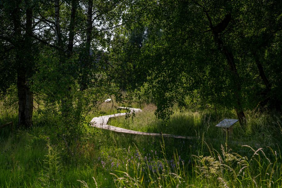 Wandelaars ontdekken de moeraslanden van het Éislek over 10,5 kilometer. Het pad loopt deels over houten loopbruggen, biedt toegang tot observatiehutten en geeft de kans om zeldzame diersoorten tegen te komen.