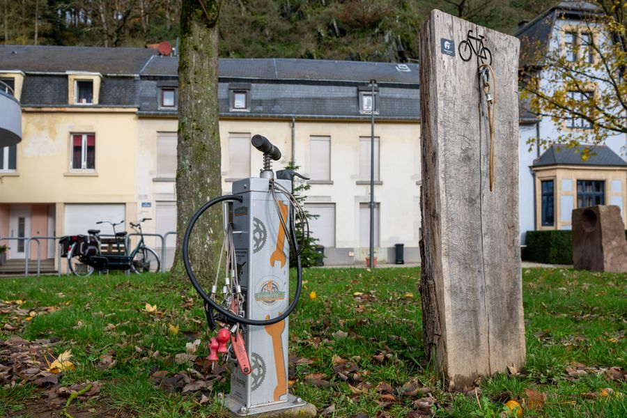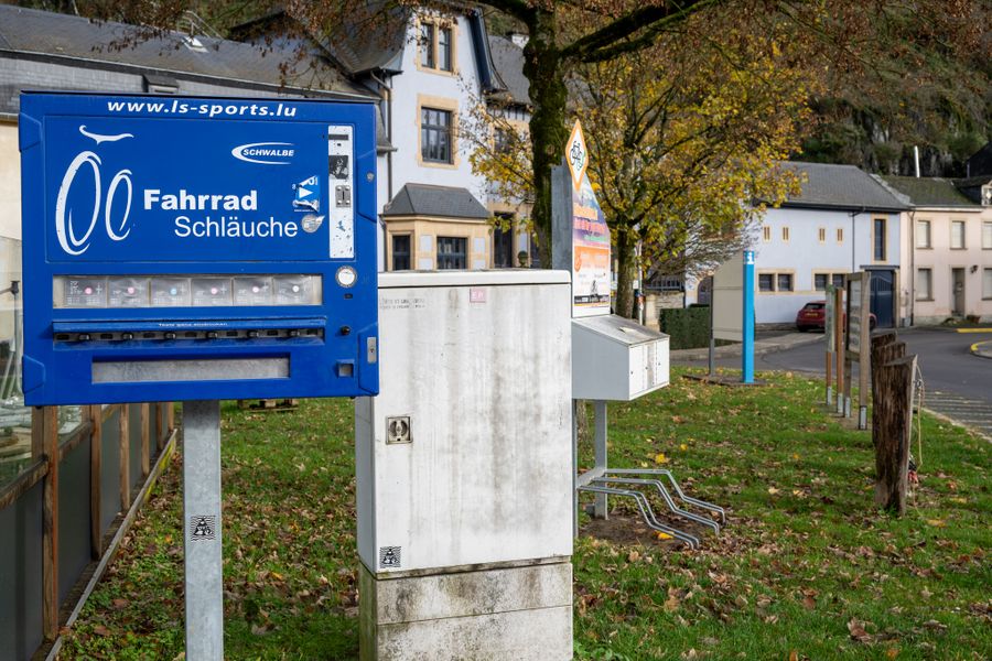 At the E-Bike charging and bike service station, you can find a selection of tools for bike repairs, as well as a vending machine with spare parts.