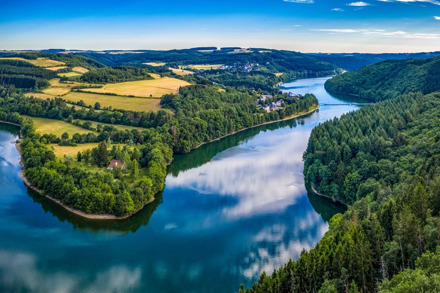 Runtschelt viewpoint south of Kaundorf offers a breathtaking view of the Upper Sûre Lake. A hike there is particularly worthwhile at sunrise and sunset, when the sky is bathed in beautiful colours.