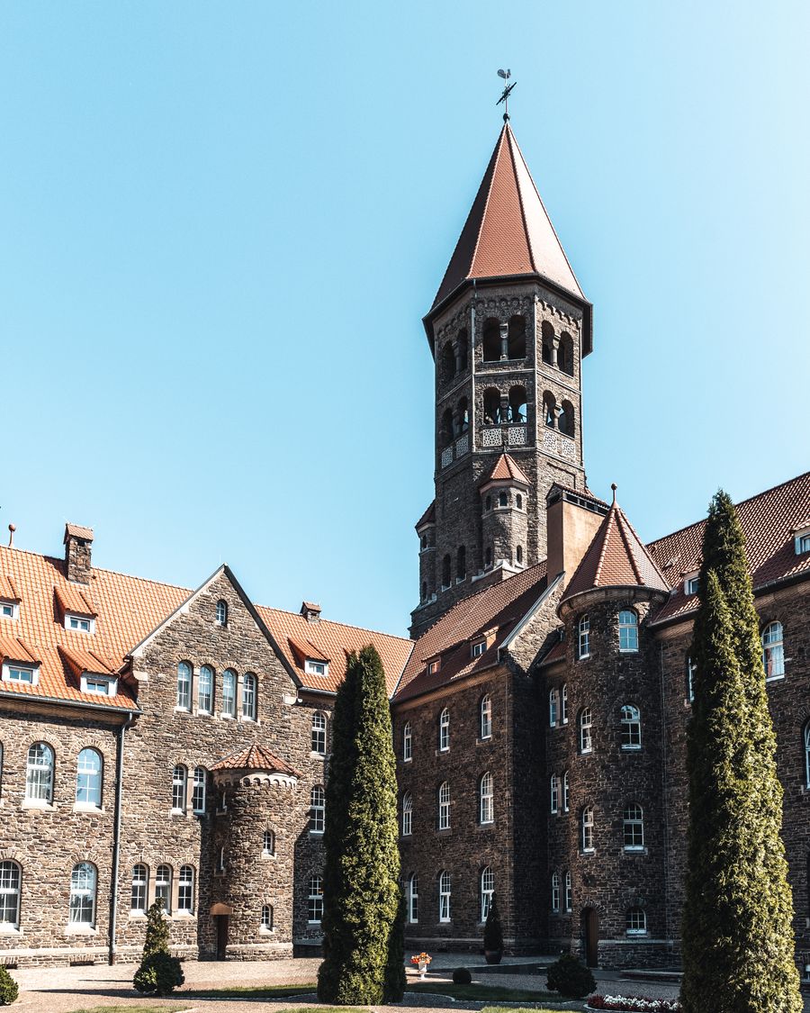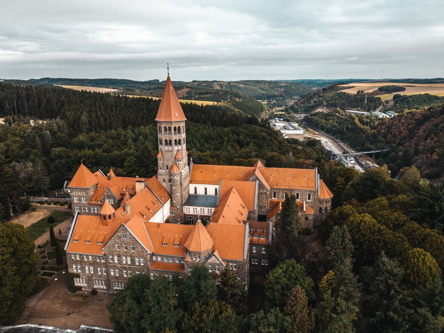 The Benedictine Abbey of St Mauritius towers with its bright red roofs over the city of Clervaux. Built in 1909/1910 in the neo-Romanesque style, it was settled by the Benedictines of the French Abbey of St-Maur de Glanfeuil.