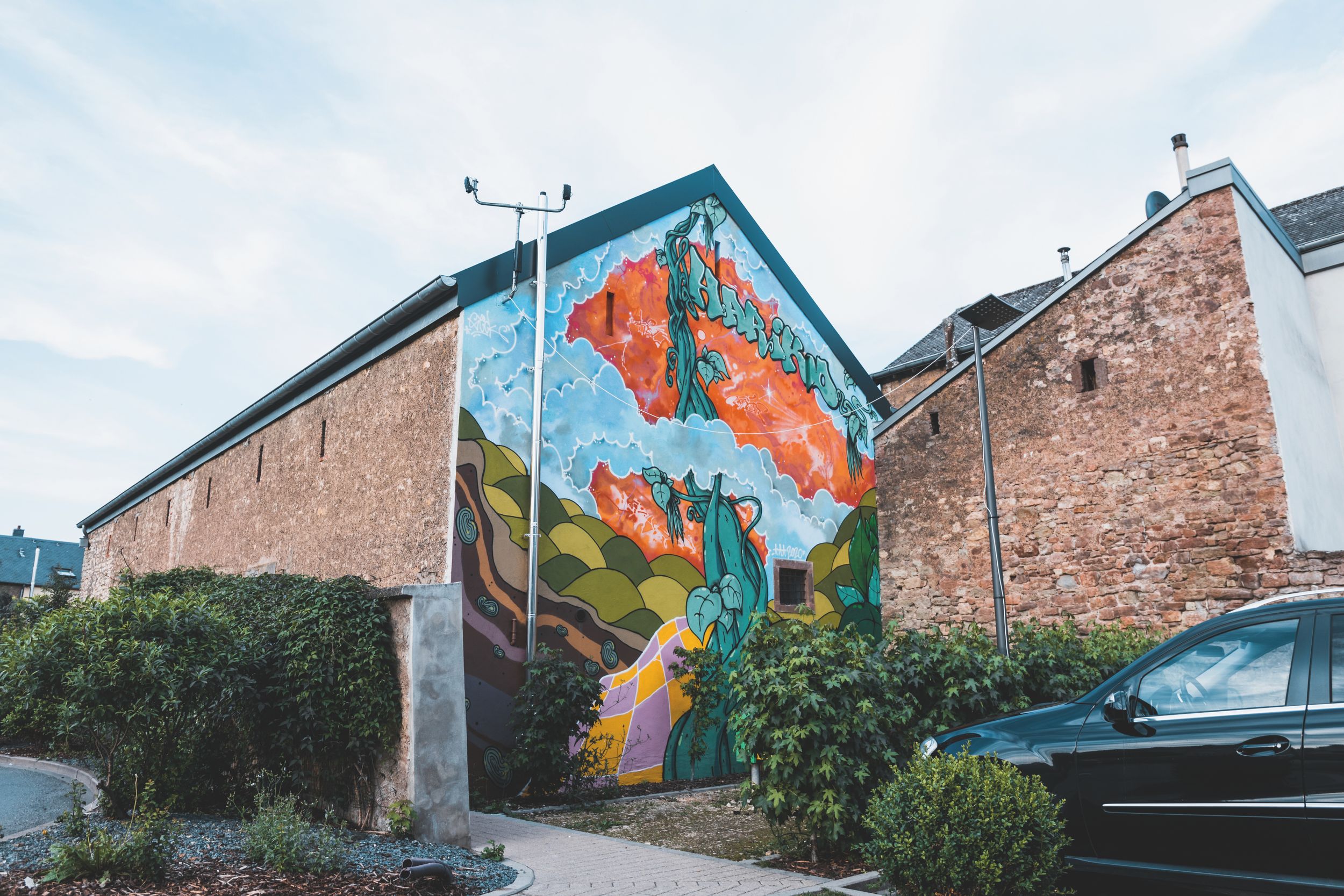 The second artwork on the square is a colorful graffiti by Stick, which immediately catches the eye with its green vines and orange background.